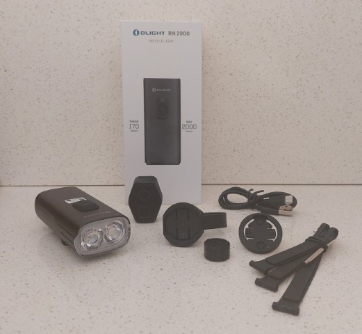 La RN2000, un supporto a fascetta con attacco Garmin ed un supporto con attacco GoPro, il telecomando, un piccolo velcro per fissare il telecomando, un cavetto USB-C per la ricarica, tre fascette di differente lunghezza con una chiave a brugola per il supporto.