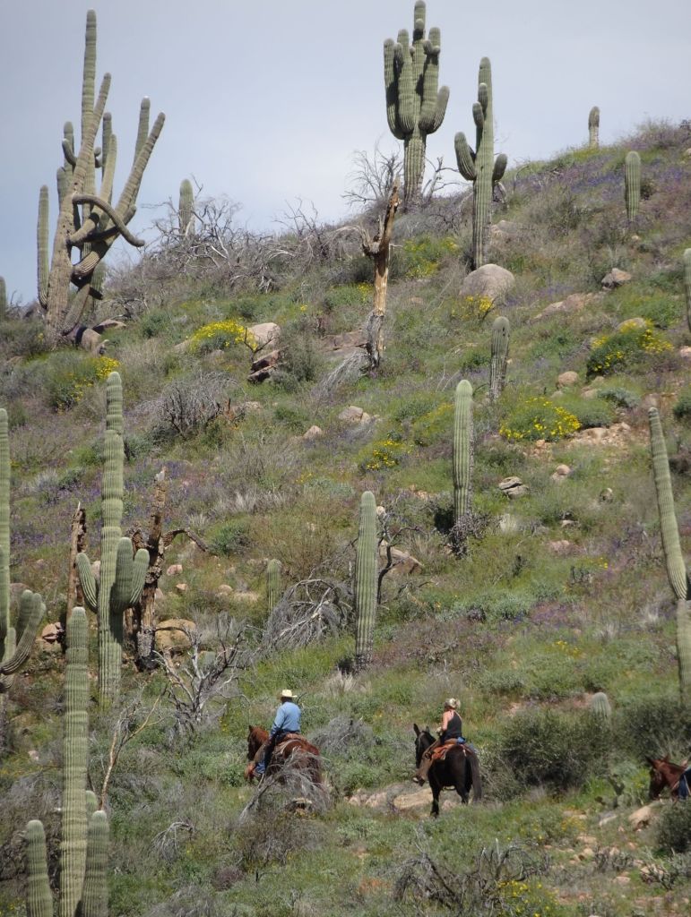 Ieri notte freddo e quindi mal di ginocchia al risveglio; fino alle due del mattino, due coglioni con musica alta hanno disturbato mezzo campeggio. Si parte sulla Usery Park Road e con una bella bike lane e molti ciclisti; dopo qualche chilometro giriamo su la Bush Highway e cominciano le moto o, meglio, le Harley, siamo ad un livello di 50 e 50 con le auto. Poi entriamo nella US 87 che sarà tutta in salita per una quarantina di chilometri. Siamo in piena fioritura del deserto uno spettacolo che dura solamente qualche giorno a primavera.