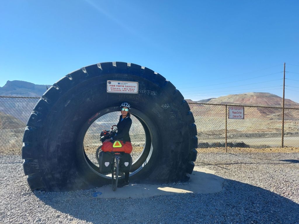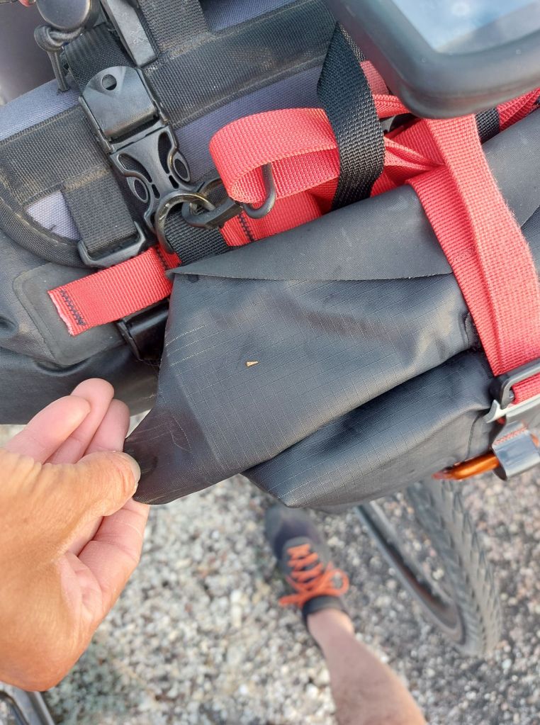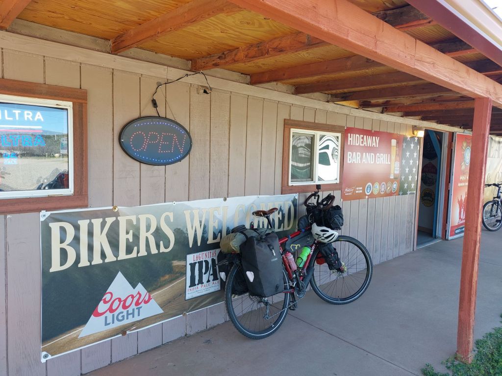 Prima di partire passiamo al negozio del distributore per comprare qualche cazzata dolce per la colazione e la sorpresa di oggi è che dopo neanche 10 km, sembra che io abbia forato. Non smontiamo la ruota, ma cerchiamo di trovare la causa e troviamo nelle due bici ben 5 spine di cactus. Provo a pompare la mia ruota posteriore che, fortunatamente, ritroverò dura e piena anche la sera dopo quasi 11 ore di viaggio. Grazie agli Schwalbe Marathon Plus Tour che montiamo da quasi 10.000 km e, nonostante siano quasi in fin di vita ci hanno permesso di non avere mai nemmeno una foratura.