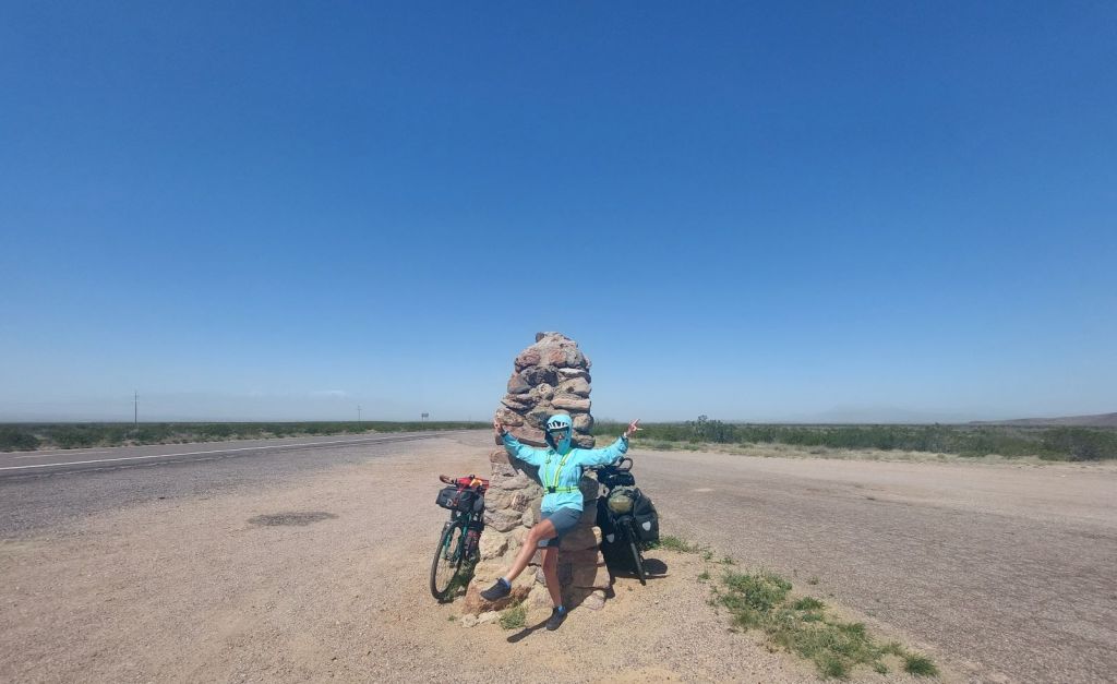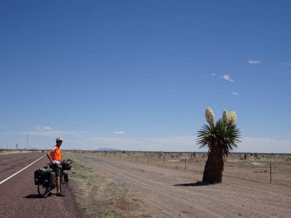 Entriamo in autostrada, piccola sosta con foto al cartello del cambio di fuso orario e lunga discesa fino a VAN HORN per cercare un posto dove dormire e fare la spesa. Mentre aspetto Manuela fuori dal supermercato, facendo la guardia alle nostre bici, si fermano due tizi. Uno alto e silenzioso e l’altro, vedendolo arrivare zoppicando, sembra faccia fatica a camminare, una discreta panza e piuttosto su di età. Parlando con loro scopriamo che sono due altri cicloturisti, che il “vecchio” ha 76 anni e che arrivano dalla South Carolina, per la precisione da Charlottetown. Praticamente sono a 3/4 del coast-to-coast.
