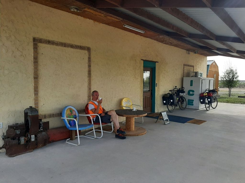 Restiamo qui causa il forte vento contrario e ciacoliamo tutto il giorno con Greg Yule, un ciclista dell’Idaho partito da Austin avendo interrotto il Southern Tier l’anno precedente proprio in quella città, ma che non vuole continuare perché non ce la fa più con il vento contrario ed il deserto.