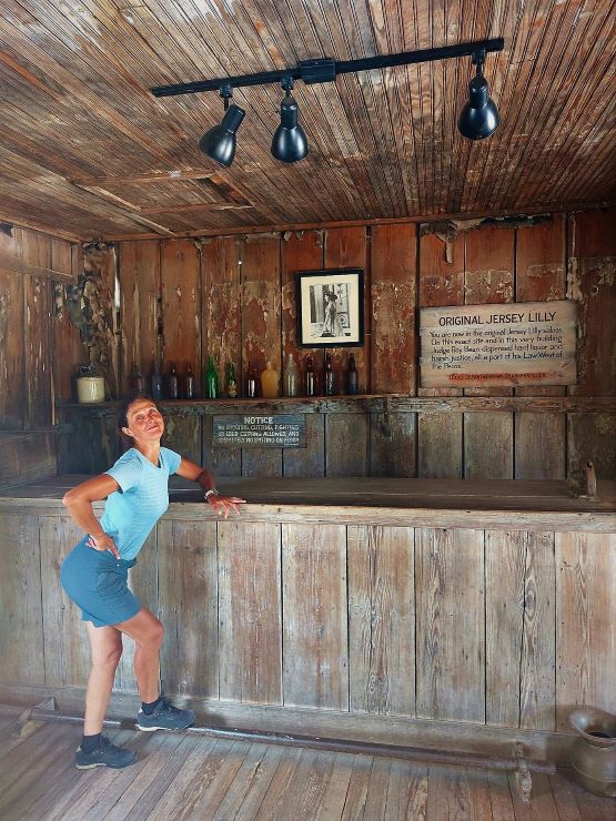 Si continua fino a LANGTRY a 98 km dalla partenza, sosta provvidenziale, poiché siamo cotti dal sole, non c’è altro posto in cui fare una sosta e manca parecchio a destinazione, senza dire che la nostra acqua comincia a scarseggiare. Ci dirigiamo al Museo del giudice Bean e troviamo aria condizionata e acqua. Al WAGON WHEEL STORE sulla TX-90 si starebbe meglio ed avremmo anche potuto dormire, ma lo troviamo chiuso ed avremmo dovuto telefonare al proprietario che, secondo i racconti dei ciclisti passati da qui, è un tipo alquanto originale.