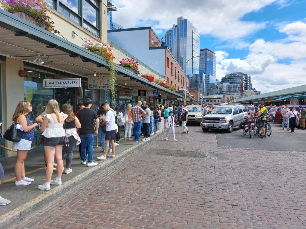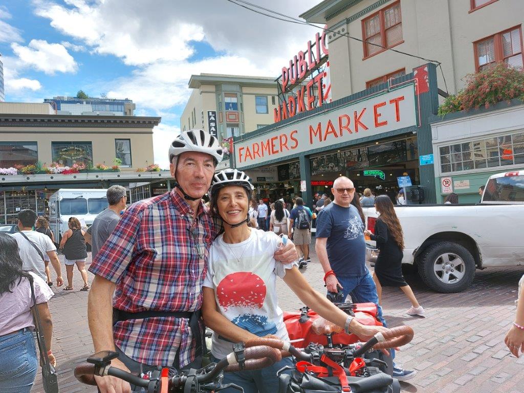 Poco prima di partire contattammo per qualche domanda extra Bill Thorness, un giornalista di Seattle autore di un libro-guida sul percorso e fu così che al nostro arrivo, ci siamo ritrovati a pedalare per le strade della sua città con lui come guida. Soste d’obbligo in downtown ed al Pike Place Market con la lunga coda davanti alla sede storica di Starbucks. Seattle è una piacevole città, moderna, piuttosto ricca (pensare a dove sono le sedi di Amazon, Microsoft, Boeing, etc.), ma anche con il contrasto dei senzatetto che campeggiano lungo i tanti canali cittadini. Bill ci dice che l’amministrazione cittadina chiude un occhio fino a quando gli assembramenti diventano problematici.