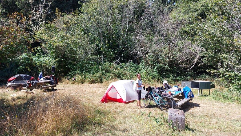 Vicino alla città di Astoria dormiremo nel primo hike and bike campsite di un parco statale. Questi siti sono a basso costo, riservati esclusivamente a chi arriva in bici o a piedi e senza bisogno di prenotazione. I migliori li abbiamo trovati in Oregon: 8 $, doccia gratuita, armadietti in acciaio con presa elettrica, utili anche per proteggere il cibo dalle incursioni notturne degli animali o di bipedi del genere sapiens. Da qui in avanti li troveremo quasi sempre, di qualità variabile, ma molto apprezzati per la facilità di avere un posto assicurato ogni notte, considerando che in estate i campeggi della costa sono sempre al completo.