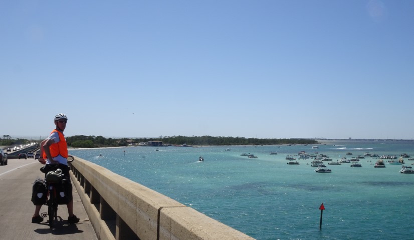 A Bonifay subiamo un Tornado Warning che ci farà dormire nella sala ricreativa del nostro campeggio discorrendo con americani che vivono in roulotte a causa dei costi esorbitanti degli alloggi. Nuova tappa fino a Panama City Beach città estremamente turistica con una fila di brutti alberghi sulle rive del Golfo del Messico. Da qui pedaliamo circa 200 km lungo la costa passando da Navarra con difficoltà di campeggio dato che qui si privilegiamo gli enormi motorhome da 40′ piuttosto che le micro-tendine dei cicloturisti. Questa sarà la parte del viaggio più panoramica, pedaliamo per una trentina di chilometri, purtroppo con un forte vento contrario, in mezzo a dune di sabbia bianchissime che spesso invadono l’asfalto lasciandoci solo un piccola striscia libera.