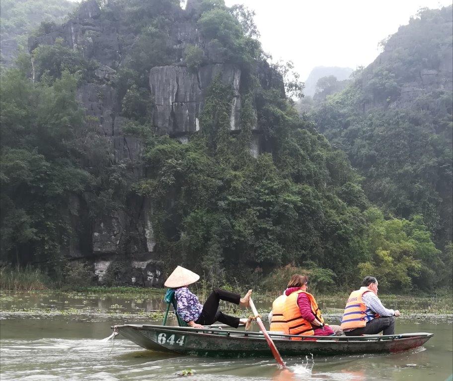 Viaggio notturno in treno e la mattina ci svegliamo a Tam Coc, dove faremo una classica e rilassante escursione in barca su un fiumiciattolo tra pareti di rocce ricoperte di vegetazione e piccole grotte. Le imbarcazioni sono guidate da rematori che muovono i remi con i piedi. Bellissimo il paesaggio e piacevole momento bucolico, ma il posto è molto “trappola per turisti”.